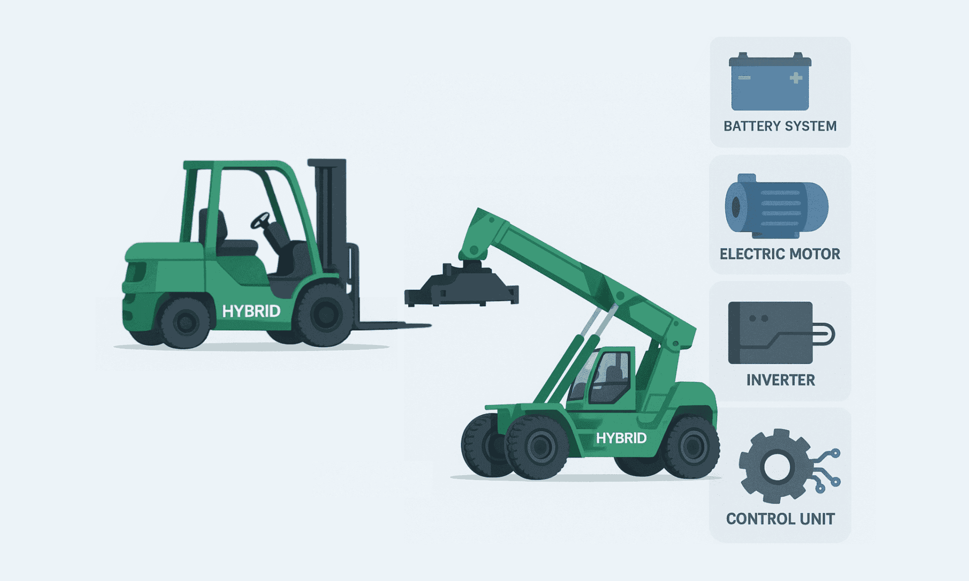 Lợi ích của động cơ hybrid trong xe nâng và reach stacker
