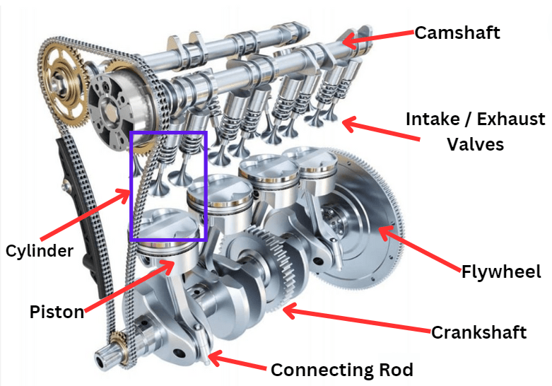 Một động cơ đốt trong tiêu chuẩn thường bao gồm các bộ phận chính: