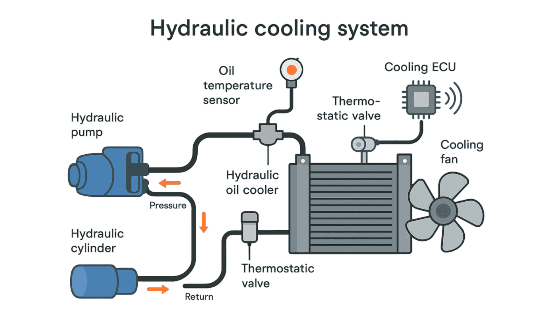 Hệ thống làm mát thủy lực (hydraulic cooling system) có nhiệm vụ duy trì nhiệt độ dầu thủy lực (hydraulic oil) ở mức ổn định, giúp hệ thống hoạt động mượt mà, bền bỉ và an toàn.