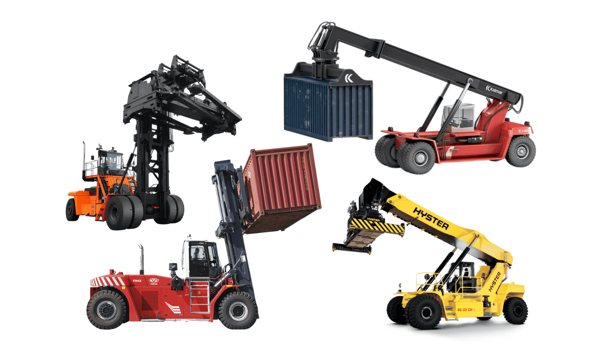 Reach stacker là thiết bị nâng hạ container chuyên dụng có khả năng xếp chồng container nhiều tầng, vươn xa hàng thứ 2, 3, vận hành nhanh và linh hoạt. Thường sử dụng ở các cảng trung bình - lớn, depot container, nơi cần xếp dỡ với mật độ cao.